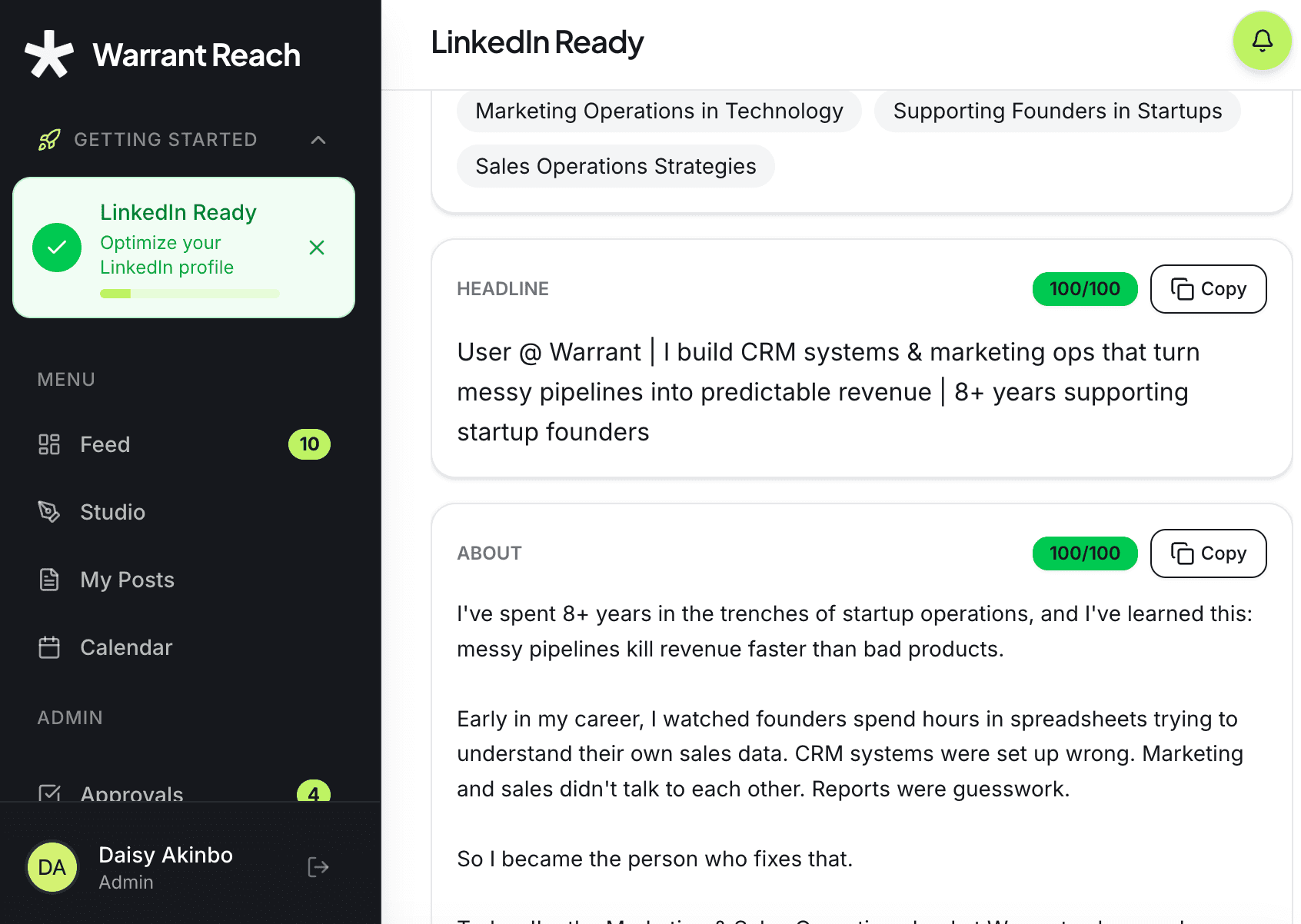 Warrant Reach surfaces three headline options for your LinkedIn profile. Choose the one that best fits your positioning and copy it into your LinkedIn headline field.