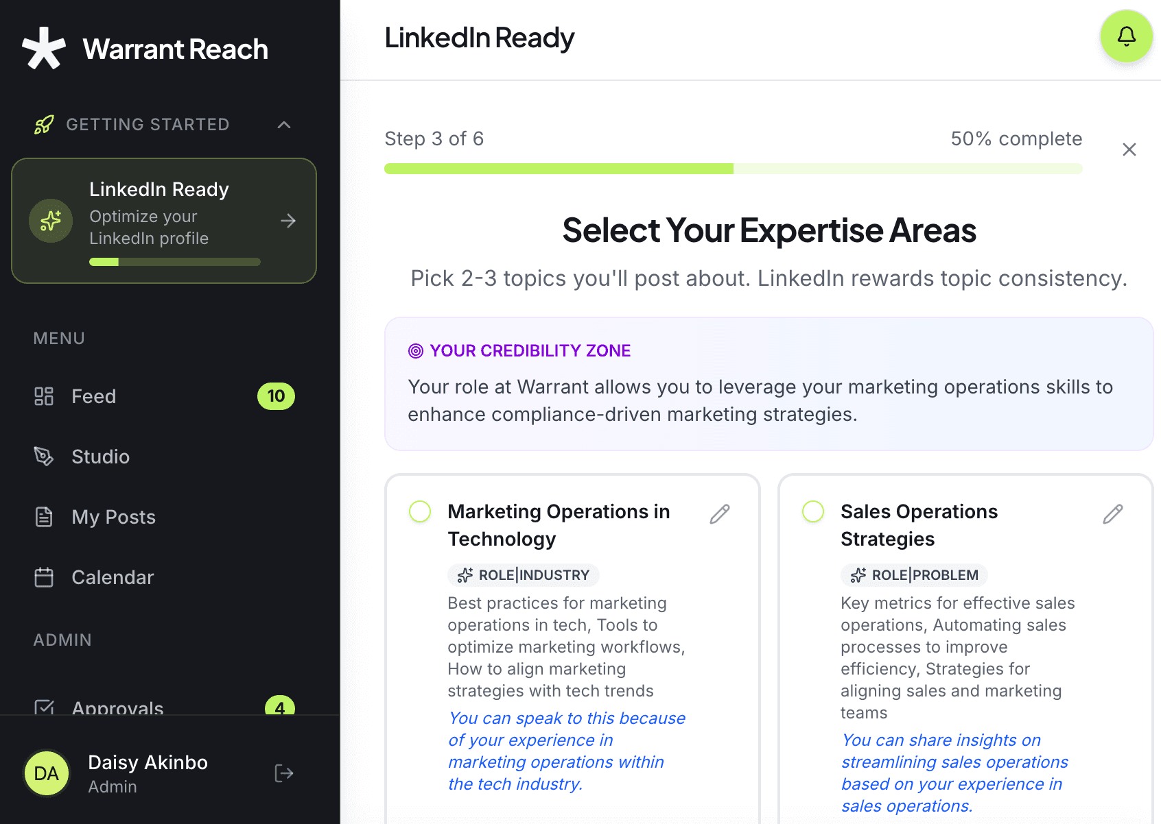 LinkedIn Optimization in Warrant Reach helps you define your credibility zone and focus your profile and content on the topics where your influence is strongest. By aligning your posting cadence, profile positioning, and topic selection, you can optimize how you show up to your network on LinkedIn.